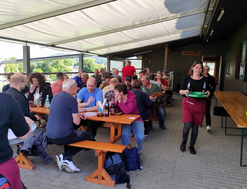Gemach, gemach, noch war der Rost leer, darum griff manch einer zum ersten Bier. Es war ja auch ein lauer Sommerabend, genau richtig für unser Vorhaben. Insgesamt machte der Schreibende zwölf Personen aus, plus einen Halben (Enkel des Wirtepaares).